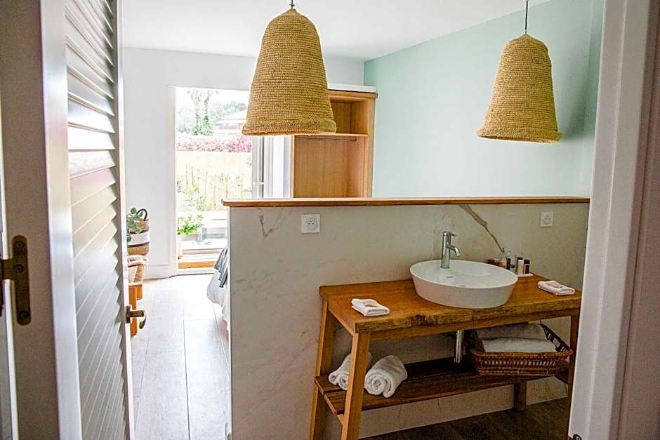 This Suite of 207 ft² is located on the ground floor of our villas on the peninsula adjoining the large house on the Ile de la Lagune, a few steps from the small wooden pontoon. It features a double bedroom and a twin bedroom, 2 shower rooms and 2 WCs, hair dryer, hair straightener as well as a private garden with a terrace equipped with a private Jacuzzi.